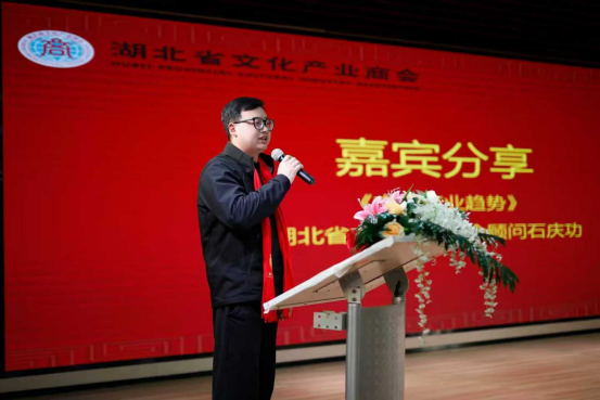 厅内鲜花簇簇,掌声阵阵,红色横幅与金色灯笼相映成趣,既饱含着辞旧迎新的喜庆氛围,更彰显着文化从业者对未来的热忱期盼。湖北省工商业联合会原副主席彭斌、湖北省委宣传部文化产业处副处长王健、武汉市洪山区政府党组成员杨海松、民生银行光谷高科技支行行长杜新颖、解放军某部原大校宋振中、湖北民进企联会副会长兼秘书长徐斌,以及湖北省文化产业商会名誉会长胡丹、会长宋旅黄、党支部书记云海、湖北省文化产业研究院院长肖希明、商会专家顾问石青、主动健康顾问孔祥坤等嘉宾悉数到场,与商会企业家们一同见证这场文化与梦想交织的盛会。
