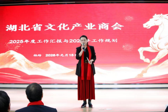 回顾过往,是为了更好地前行。商会林玲会长登台,做湖北省文化产业商会2025年总结及2026年规划报告。她用详实的数据、生动的案例,梳理了2025年商会在组织建设、产业对接、公益服务等方面的丰硕成果,也明确了2026年商会的发展方向——聚焦文化产业高质量发展,搭建更广阔的资源对接平台,助力会员企业提质增效,推动荆楚文化走向全国、走向世界。报告中的每一个目标、每一项规划,都凝聚着商会对行业发展的责任与担当,让在场企业家们备受鼓舞。