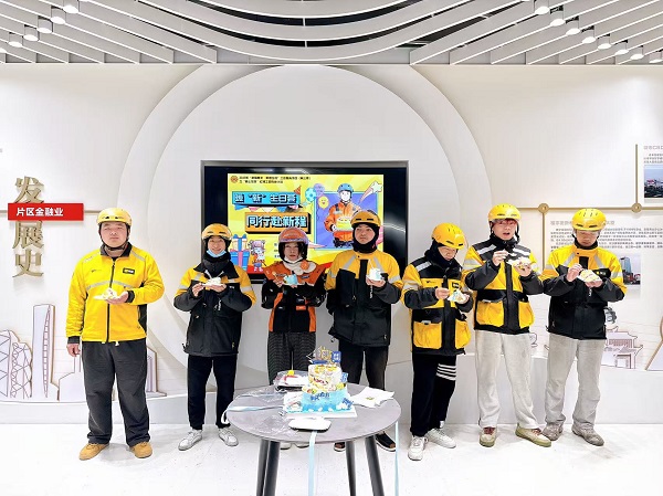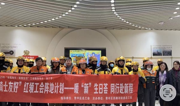 2025年12月29日,青羊区西御河街道总工会在数字金融大厦工会驿站举办“暖‘新’生日荟·同行赴新程”主题活动,为12月-1月过生日的外卖骑手、快递员等新就业群体代表送上关怀,这是“骑士友好”红领工会阵地计划的首个落地项目。