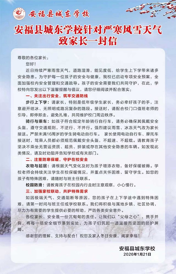 学校发布《致家长一封信》,从出行、保暖、应急三方面发出倡议。提醒家长接送低年级学生时全程看护,严禁未满16周岁学生骑电动车,驾乘车辆需规范佩戴头盔、杜绝危险乘车。同时建议家长做好孩子保暖,学校也重点关怀困难及留守儿童。学校健全应急联动机制,落实校园值班与校园巡逻制度。若学生遇交通阻断等困难,可第一时间联系学校。