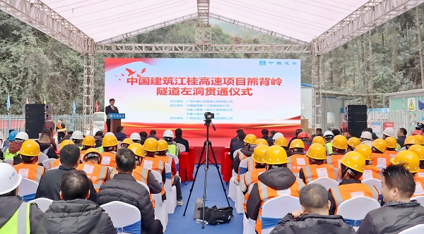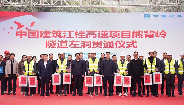 1月28日,广西江桂高速公路项目熊背岭隧道左洞举办贯通仪式。灵川县人大常委会副主任、县总工会主席,县高速公路建设项目协调服务指挥部副指挥长唐于辉,中建七局党委常委、副总经理李俊杰,中建基础广西公司党委副书记、总经理吴永红,中建七局一公司党委副书记、总经理王喜龙,广西中建江桂高速公路有限公司党委书记、总经理朱骊出席仪式。