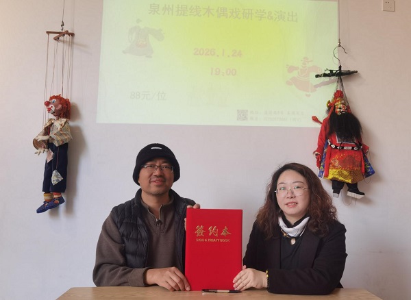 泉州木偶书店主理人康先生接受实践团队采访并与三明学院能量动漫负责人张玉琴副教授签订“掌中偶”研学玩具产品开发合作协议