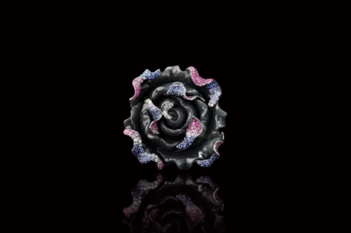 18K白金天然彩宝墨玉牡丹花戒