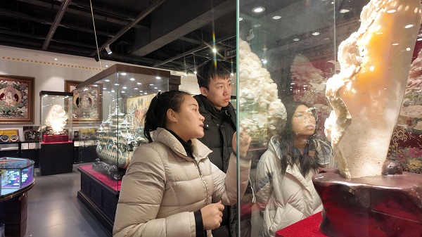 图4,实践团调研徽墨制作12道古法工序 黄山脚下,团队直观认识到了“活态传承”与“数字融合”的巨大潜力,更明白:非遗的内核,在于“静”与“守”;非遗的生命力,在 于“用”与“变”。 02 本土深耕:大连贝雕“对话初心” 渤海之滨,实践团带着调研形成的“徽州经验”,走进金阿山艺术馆,与国家级非遗传承人金吉老师展开深入访谈。对话过程中,未来书院成长导师、伯川图书馆馆员刘姝瑾老师与成员一道,就贝雕技艺的传承现状与创新路径展开交流。徜徉于大连贝雕的艺术殿堂,无数贝壳打磨拼接而成的珍品散发着温润光泽,也激励着成员们以数字技术为媒、持续为传统技艺注入新生命力的决心。金吉老师对数智赋能贝雕文化创新性发展表示充分认可,“酒香也怕巷子深,这么美的贝雕,不该被时代遗忘”,殷切期待里流露着的正是那份工匠精神。