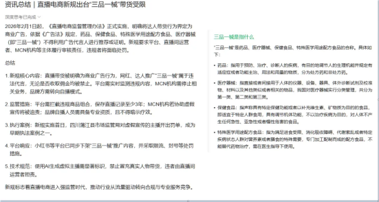 各位大健康行业的老板们,注意了! 2026年2月1日,《直播电商监督管理办法》正式施行。 这次新规对"三品一械"的直播带货作出了明确规定,如果你还在用老思路,很可能面临巨额罚款! 今天帮大家划重点,一定要记牢! 什么是"三品一械"?达人带货受限! 新规明确:"三品一械"类产品的直播营销需特别注意! 三品:药品、保健食品、特殊医学用途配方食品 一械:医疗器械 重点来了:根据《办法》,网红达人在直播电商活动中以自己的名义或形象对商品作推荐、证明,原则上构成商业广告行为,需履行广告代言人义务。 而依据《广告法》,"三品一械"不得利用广告代言人作推荐、证明。