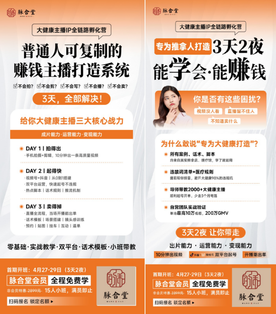 脉合堂直播实拍↑ 如果你正在做直播,或者准备入局大健康赛道,现在正是系统提升自己的最佳时机。 《大健康主播IP全链路孵化营》 3天2夜·线下小班 青岛丨4月27日-29日 从0到1,成为能赚钱的主播 3天,你带走什么? √运营方法 → 账号从0做到1,精准涨粉 √带货话术 → 直播间会说话,提高转化 √拍剪能力 → 短视频自己搞定,不用求人 …… 3天2夜,给你大健康主播核心战力 √会拍 √会剪 √会写 √会播 √会卖 脉合堂会员可免费学习! 非会员,扫码领取限量免费试听席位