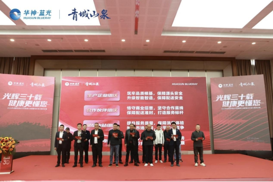 庆典尾声,营销中心、服务部门及合作伙伴共同登台宣读行动宣言,以铿锵誓言许下对未来的郑重承诺。 三十而励,踔厉奋发。未来,华神·蓝光将继续坚守初心,与行业同仁携手,让川水品牌走向更广阔的舞台!