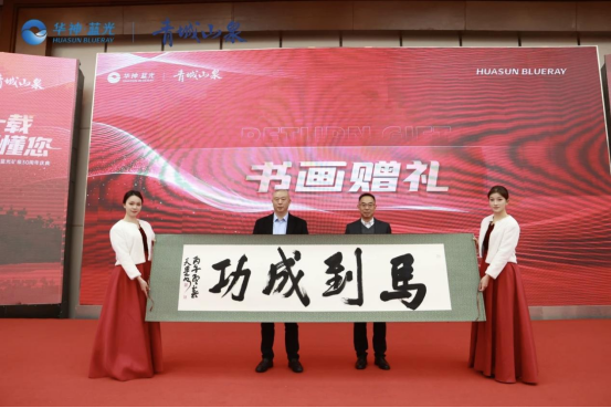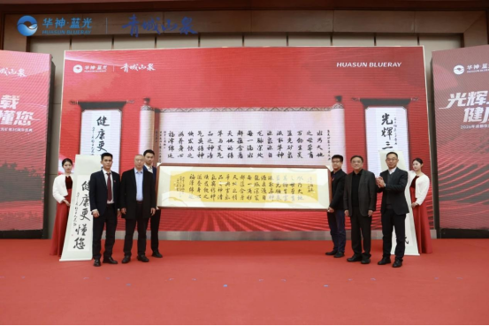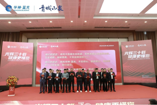 · 坚守桶装水主航道,夯实核心业务,打造一桶好水,无需担心品牌主张,以守正立基 · 深耕“问道文化”与健康饮品赛道,以创新撬动估值增长 · 以“青城山泉”为核心品牌 · 打造“问道青城·道家自然”“佛法峨眉·佛家清净”双品牌、双文化高端产品矩阵,提出了品牌语言,想巴适生活,喝青泉山泉,让战略回回归消费认知,真正融入巴蜀大地的烟火气里。 企业将以文化赋能品牌,以健康扎根市场,致力于让每一位用户都能喝上放心好水。 七、荣耀共鉴:同心同行,致敬卓越 大会现场颁发了“2025年目标达成奖”“三十载专营专卖奖”“三十载贡献奖”“三十载战略合作奖”等多项荣誉,近百位合作伙伴、优秀员工与合作企业获颁表彰。 四川硬笔书法协会副主席蓝天果现场赠予 “水脉华章” 书法墨宝,并以悬空悬笔绝技书写 “马到成功” ,祝愿华神·蓝光在下一个三十年一马当先。