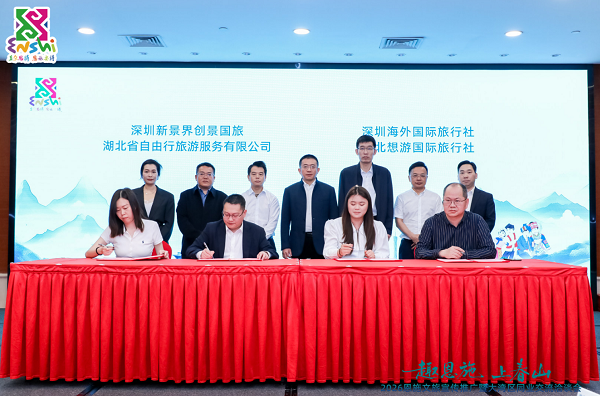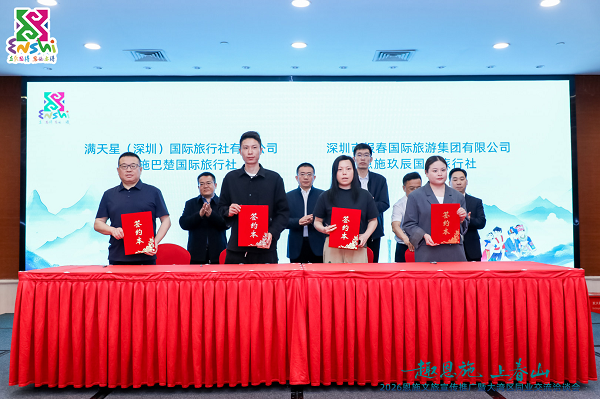 深化合作+现场签约:双向赋能促共赢 活动现场,恩施州湖北省自由行旅游服务有限公司、湖北想游国际旅行社、恩施巴楚国际旅行社、恩施玖辰国际旅行社分别与深圳新景界创景国旅、深圳海外国际旅行社、满天星(深圳)国际旅行社有限公司、深圳市报春国际旅游集团有限公司签订战略合作协议。双方将联合开发定制化、高品质旅游线路,打通从资源端到客源端的高效链路。此次签约不仅标志着恩施州与大湾区两地文旅合作从“单向引客”迈向“双向赋能”的新阶段,也为两地文旅产业高质量发展筑牢了坚实的合作根基。
