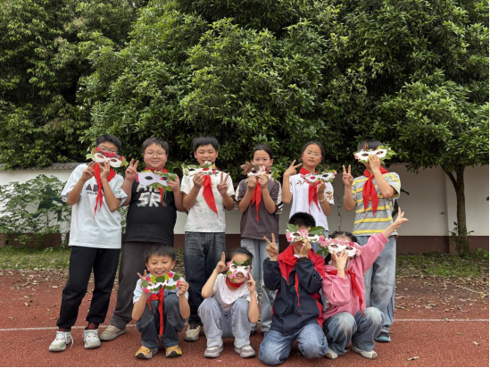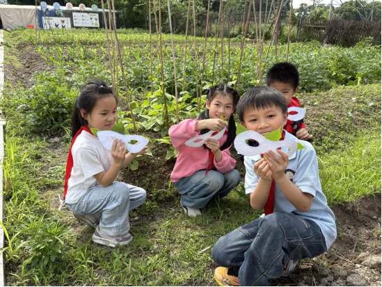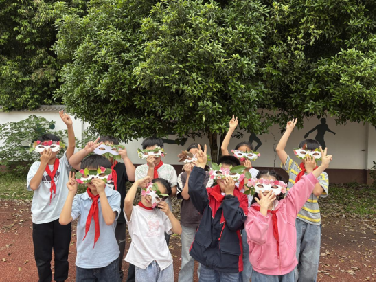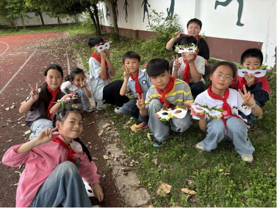 最后,孩子们戴着亲手制作的植物面具,在蓝天农场、校园花坛旁拍下创意合照,用笑容与色彩,接住了春天的最后一场雨,也留住了整个春日的浪漫。