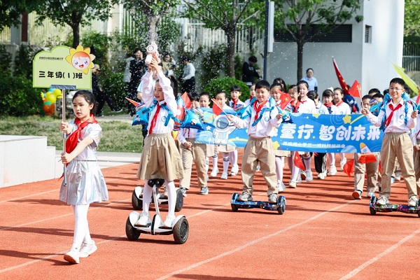 伴随着激昂的音乐,活动正式拉开帷幕。在郑州市中原区少先队总辅导员鹿坤的郑重宣布下,彩球腾空飞扬,《运动员进行曲》瞬间点燃全场!国旗班昂首阔步,尽显飒爽英姿;郑州科技馆的专业裁判员团队紧随其后,化身赛场上的公正守护者,用专业与严谨为科技竞技护航。 各年级方阵依次入场,朝气蓬勃。入场式以“穿越时空的科技之旅”为主题,各年级演绎科技演进历程。一年级以“古代文明”为主线,手持火药、司南、字模与纸鸢,致敬中华智慧;二年级以“交通变迁”为脉络,从绿皮火车到复兴高铁,生动演绎“中国速度”;三年级化身“小小太空人”,平衡车与飞行器交织出探索星辰大海的画卷。每一个年级都是一段科技史,每一张笑脸都是一颗未来之星。