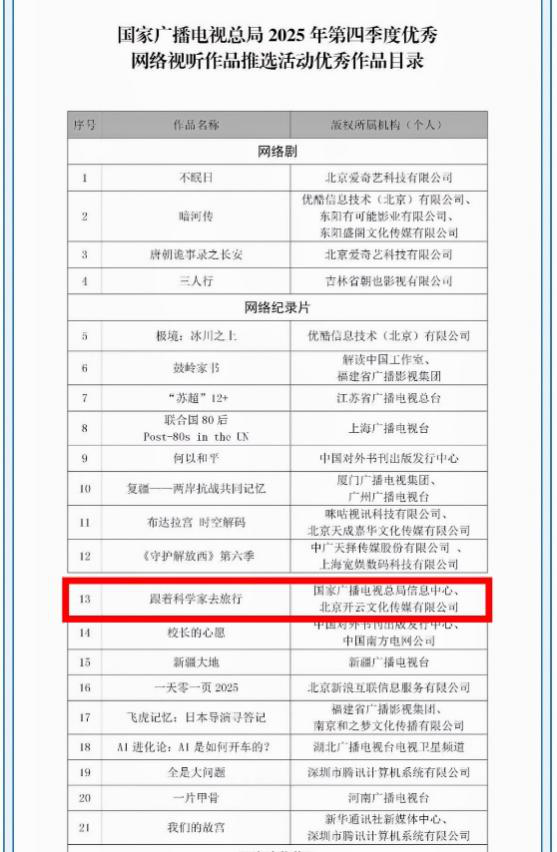 近日,国家广播电视总局正式公布2025年第四季度优秀网络视听作品推选活动入选名单,全国共99部精品作品脱颖而出。由国家广播电视总局信息中心、北京开云文化传媒有限公司联合出品的科普纪实节目《跟着科学家去旅行》 成功入选网络纪录片单元,摘得网络视听领域极具分量的权威奖项,以独特的行走科普模式,树立行业全新标杆。
