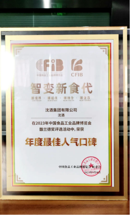 2023年9月8-10日,以“智变新食代”为主题的“2023中国食品工业品牌博览会暨中国食品产业双循环发展大会(简称CFIB)”,在四川成都世纪城国际会展中心举行。中国沈酒在消费者满意度、品牌美誉度上具有突出表现,经中国食品工业品牌博览会馥兰德奖评审委员会专家组评定,获得2023中国食品工业品牌博览会馥兰德奖年度最佳人气口碑荣耀。